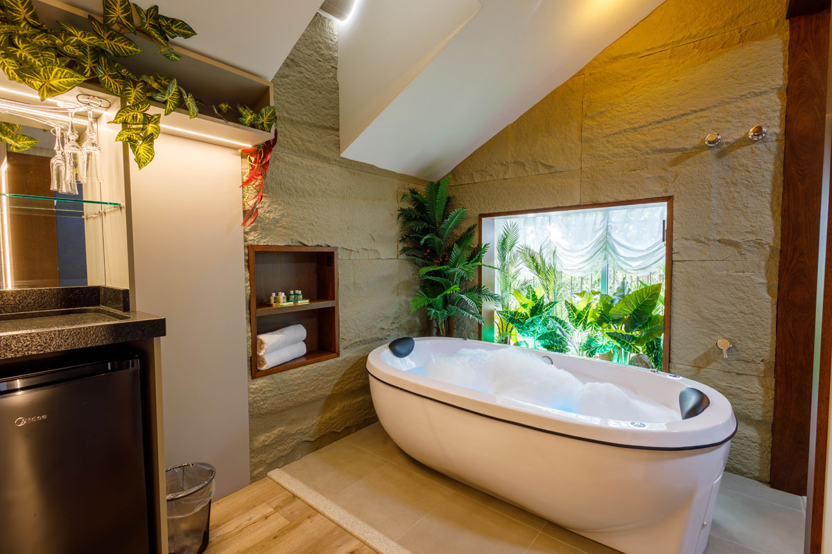 Possui acesso por ELEVADOR, com piso Vinílico, isolamento térmico/acústico, TV Smart, ar-condicionado, Mini-bar, cama KING, Mesa, Área de Leitura e uma belíssima Banheira de Hidromassagem.