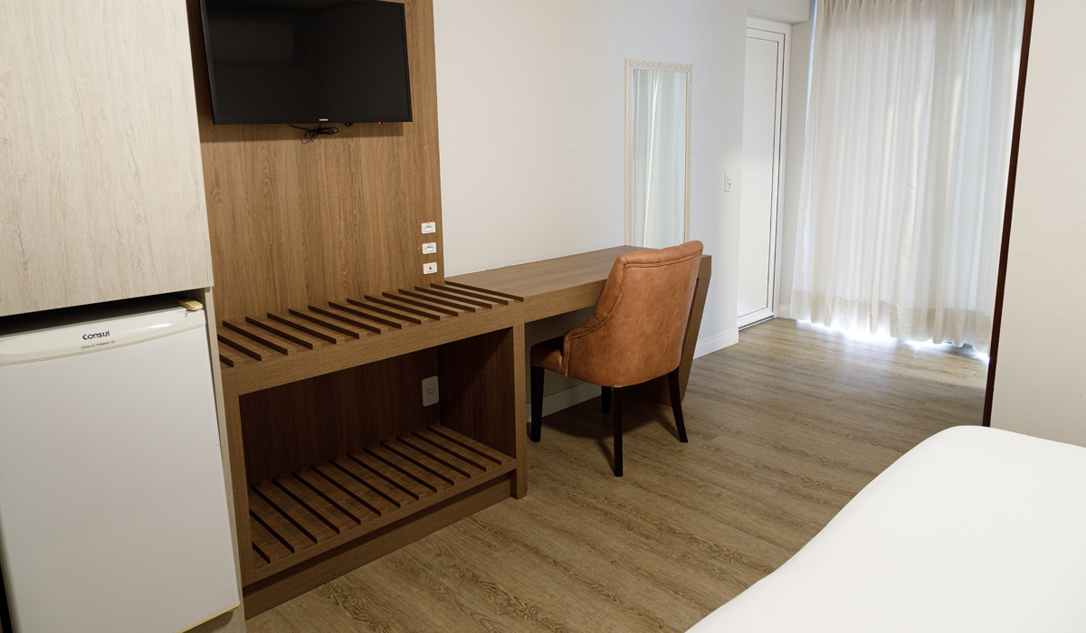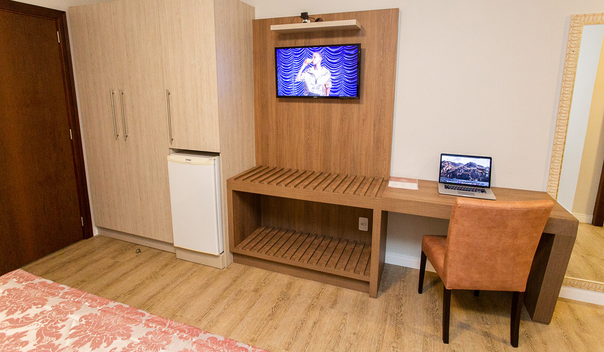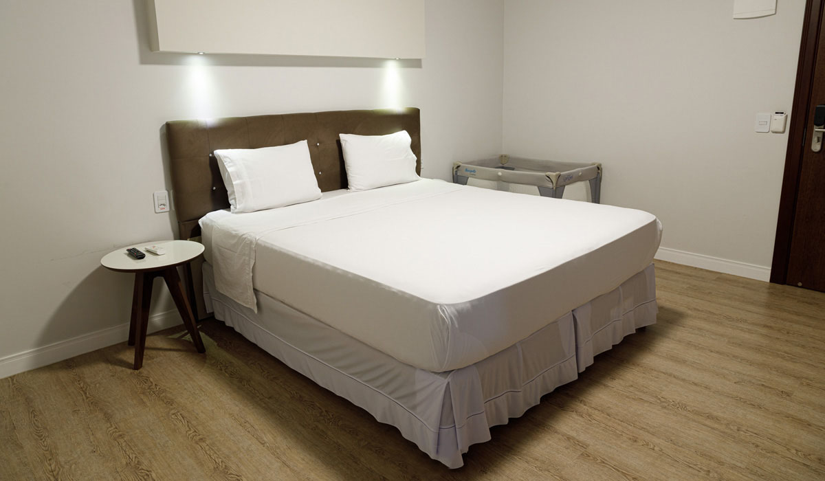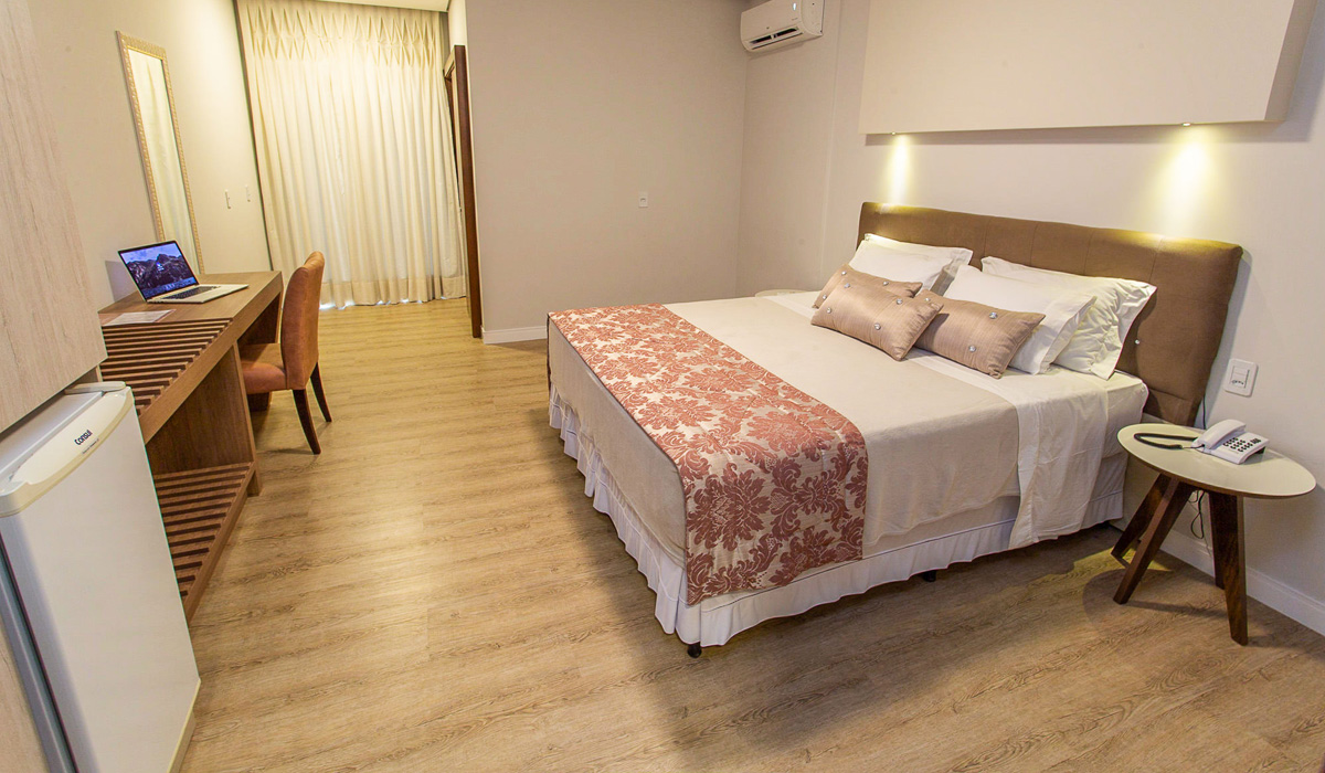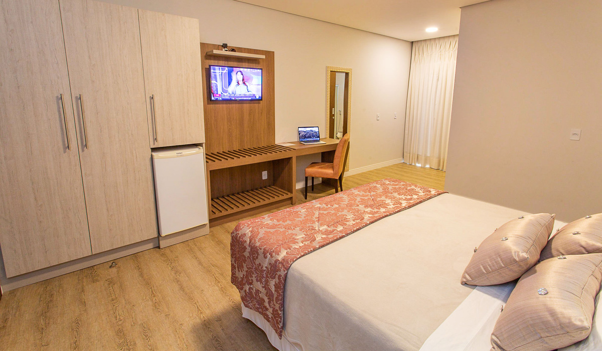 Localizadas no 1º e 2º andar com acesso por elevador, são suítes de até 24m² com sacada, aberturas com isolamento termoacústico e piso vinílico. Possuem Smart TVs conectadas à internet, frigobar, telefone para uso interno, internet, cama de casal grande (1,78 x 1,98) e atendem até 05 pessoas e também na configuração Suíte Conjugada.