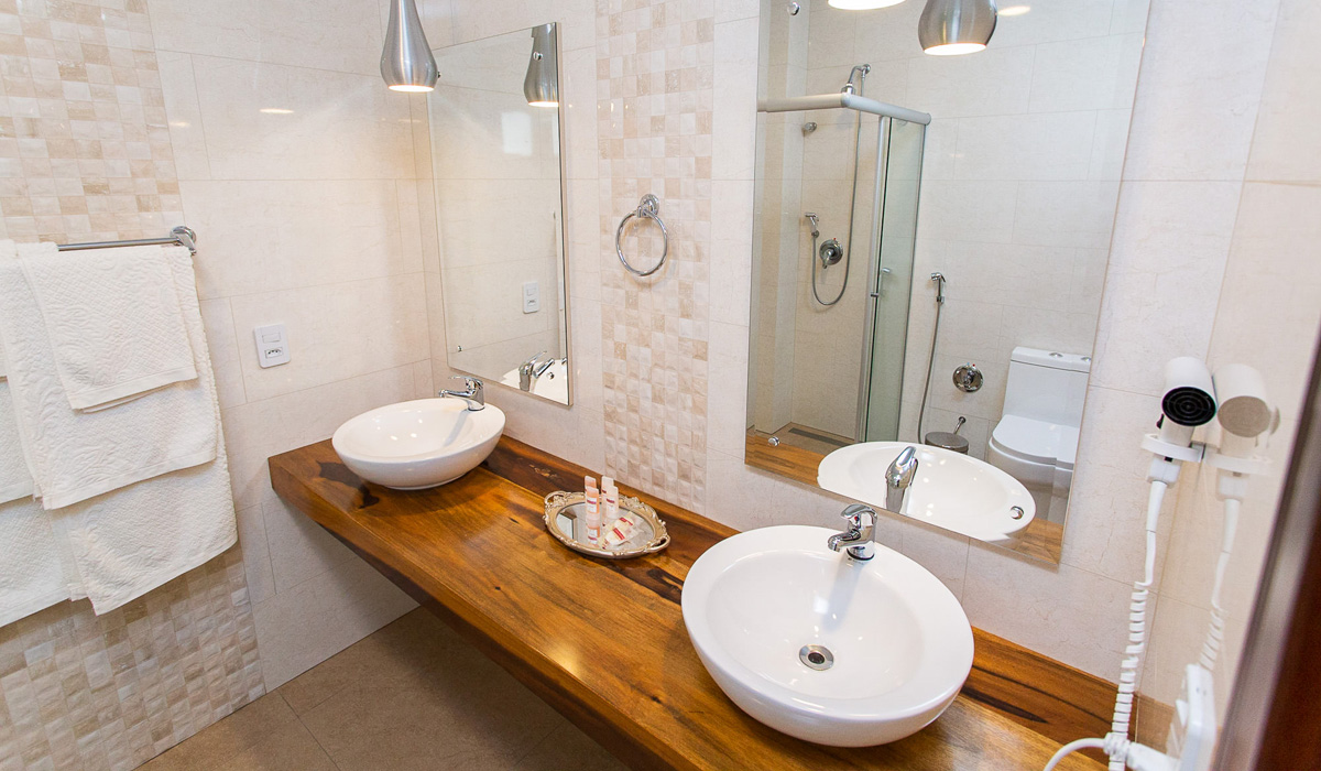 Os banheiros são equipados super ducha, bancada com duas cubas, ducha higiênica, secador de cabelo, amenidades de banho, toalhas de banho e rosto.