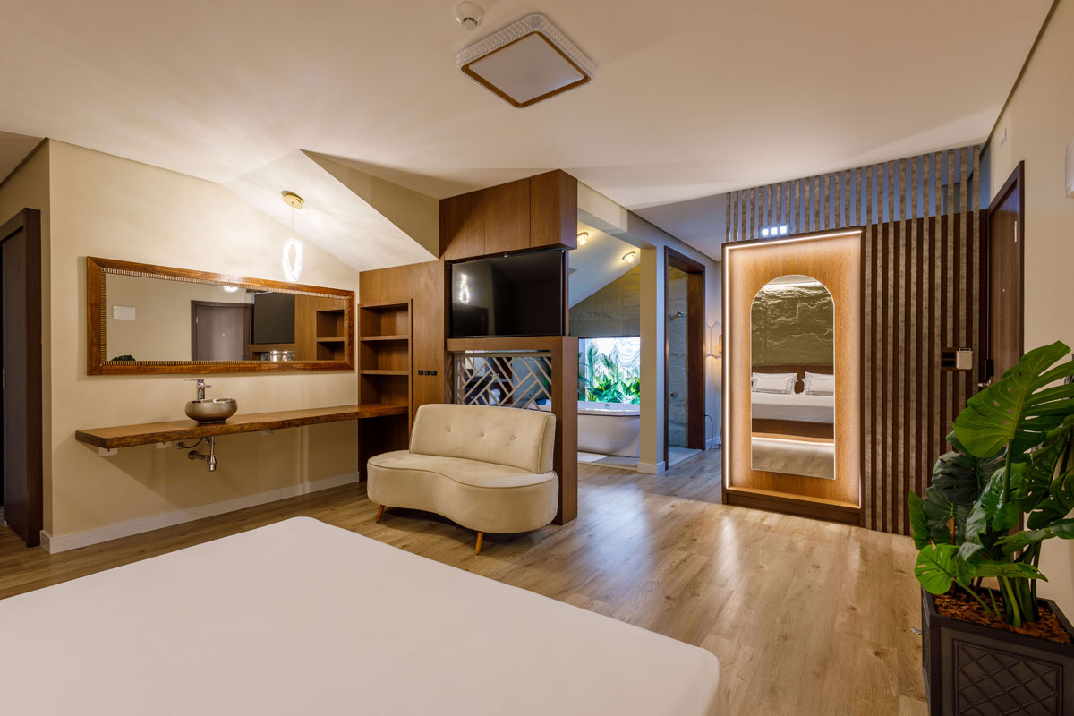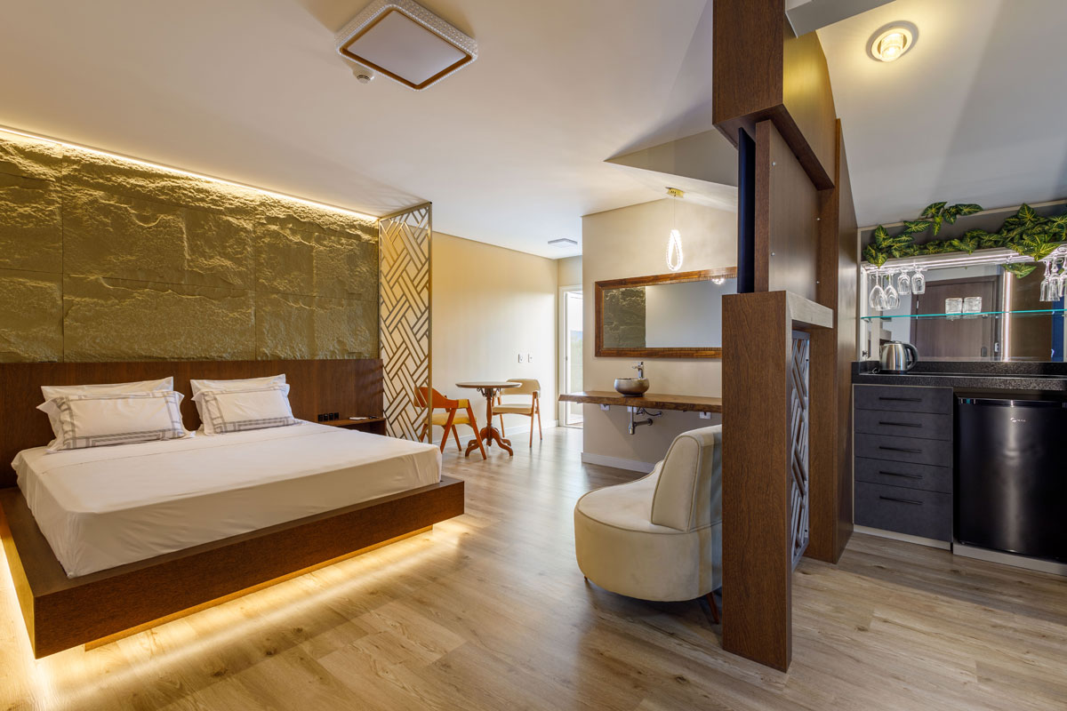 Nossa Suíte MASTER é nossa mais nova opção de hospedagem, uma Suíte exclusiva que fica no andar mais alto do Lena Rosa Premium Hotel e possui aproximadamente 40m².