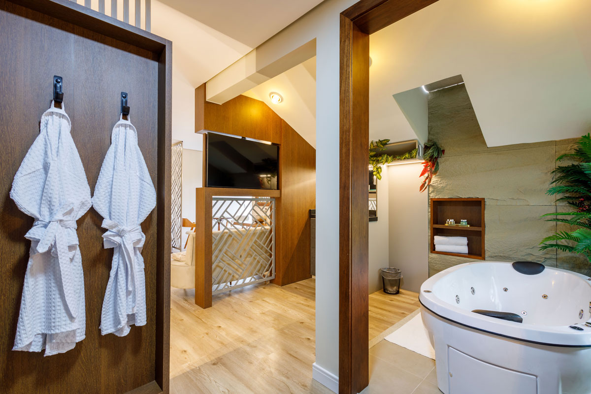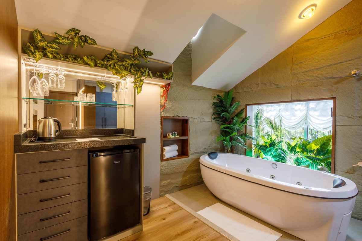 Possui acesso por ELEVADOR, com piso Vinílico, isolamento térmico/acústico, TV Smart, ar-condicionado, Mini-bar, cama KING, Mesa, Área de Leitura e uma belíssima Banheira de Hidromassagem.