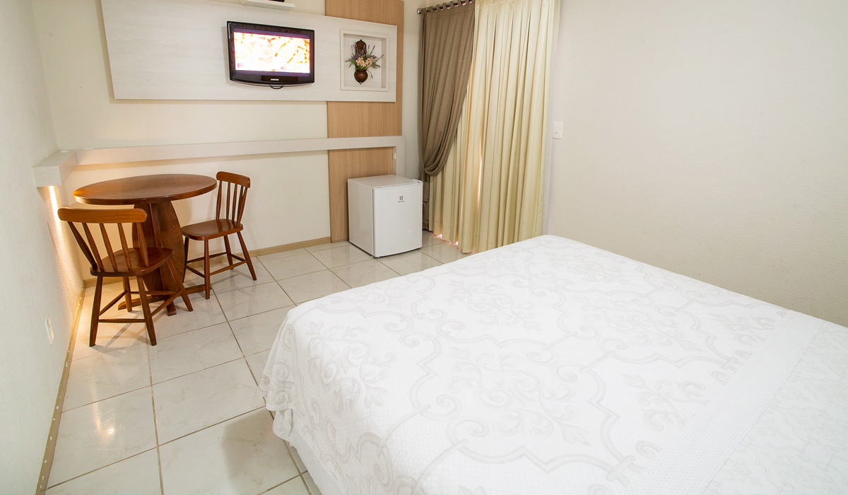Nossas Suítes Standard são suítes de até 18 m² que possuem sacada, piso cerâmico, ar condicionado Split, TV, frigobar, telefone e internet.